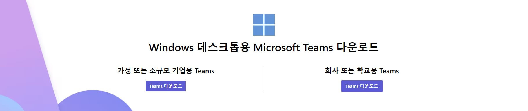 저는 데스크톱용(PC) 다운로드 버튼을 누르자 아래에 있는 데스크톱용 마이크로소프트 팀즈 다운로드 페이지로 넘어왔습니다. 여기서 우리는 개인일 경우 좌측에 있는 가정 또는 소규모 기업용 팀즈를 다운로드하면 되는데, 만약 회사 또는 학교에서 팀즈를 무료로 제공해 주는 곳은 우측에 회사 또는 학교용 팀즈를 다운로드하면 됩니다.