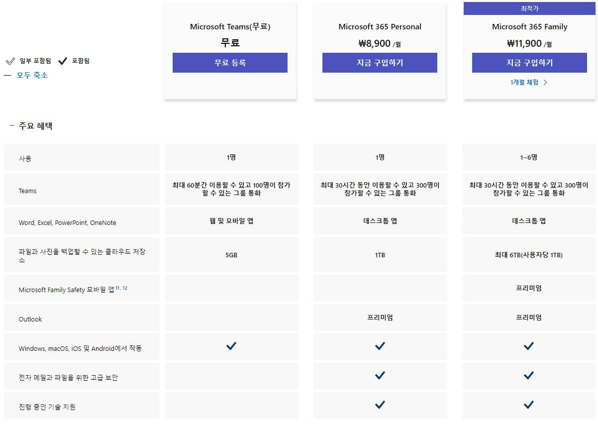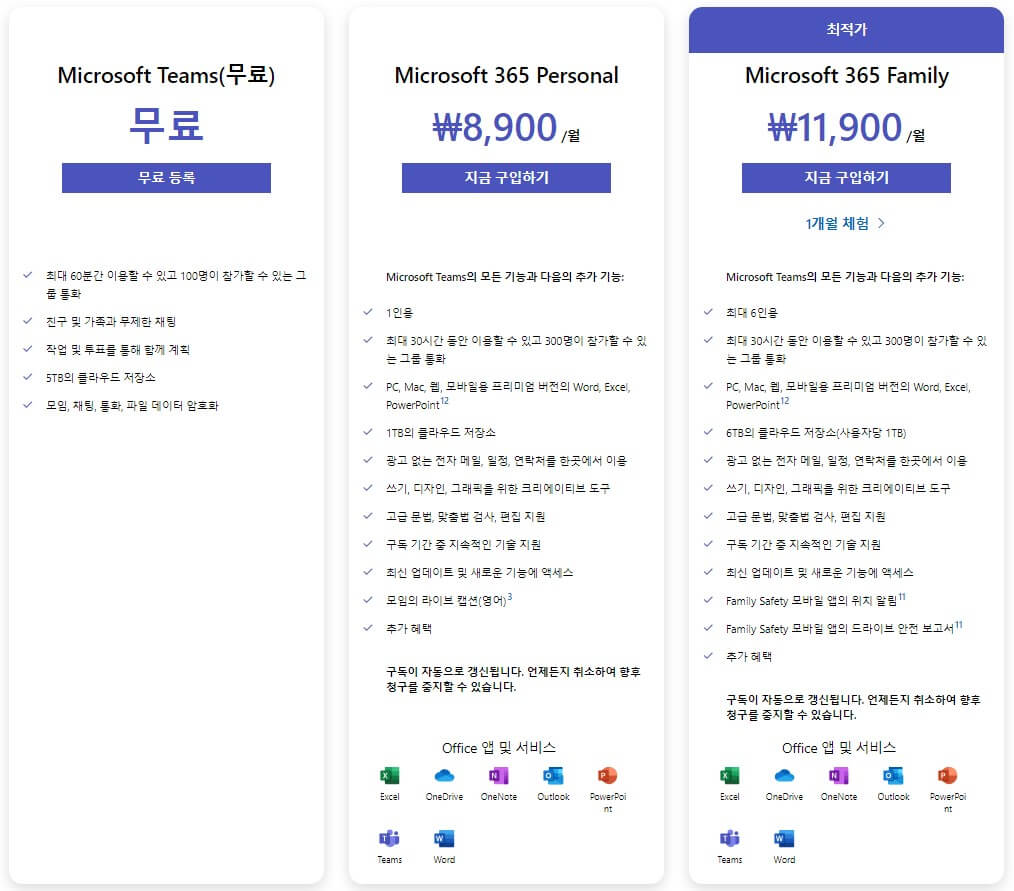개인/가정용으로 이용하는 팀즈의 가격은 무료부터 월 8,900원과 11,900원까지 세 종류로 구분됩니다. 무료버전에는 기본적인 기능이 제한적으로 제공되는 반면, 유료 버전에서는 다양한 기능이 추가되며 무료버전에 걸려있던 제한들이 일부분 완화되는 것을 볼 수 있습니다.