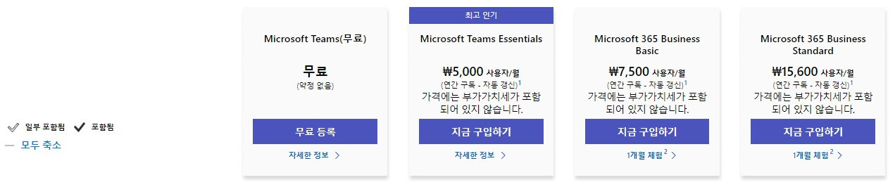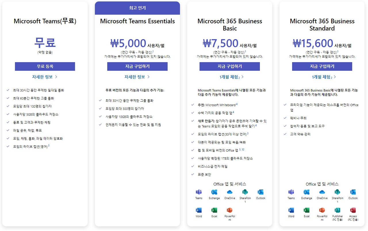 마이크로소프트 팀즈 목적 및 가격별 기능 비교 >> CLICK