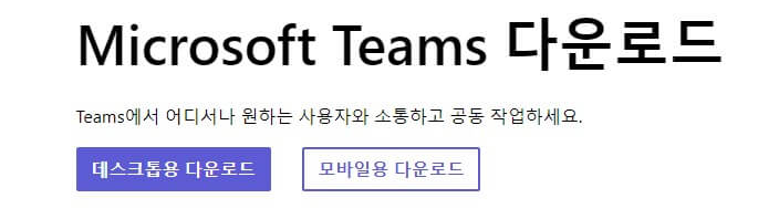 마이크로소프트에서 제공하는 무료 화상회의 프로그램 팀즈는 위 링크를 통해 사이트에 접속하면 무료로 다운받을 수 있습니다. 링크를 통해 접속한 사이트에서 데스크톱용(PC)과 모바일용(핸드폰) 중 하나를 선택하시면 자동으로 다운로드 페이지로 넘어가게 됩니다.